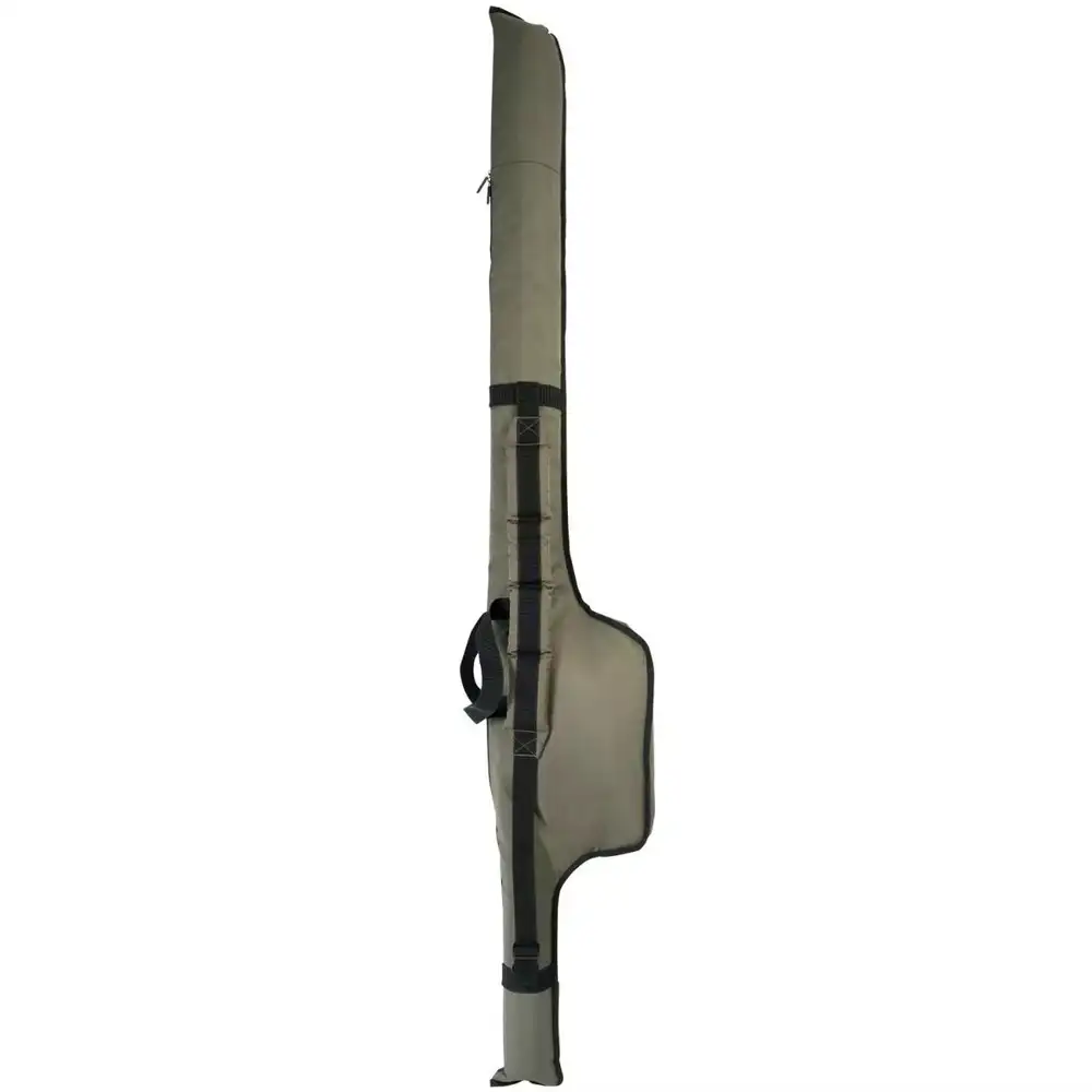Diese einfache 2-Rutenhülse, ermöglicht die problemlose Lagerung von drei montierten Ruten. Sie enthält einen äußes Fach für zusätzliche Ruten oder Kescherstäbe. Der Tragegriff und der gepolsterte, verstellbare Schultergurt erleichtern das Tragen.